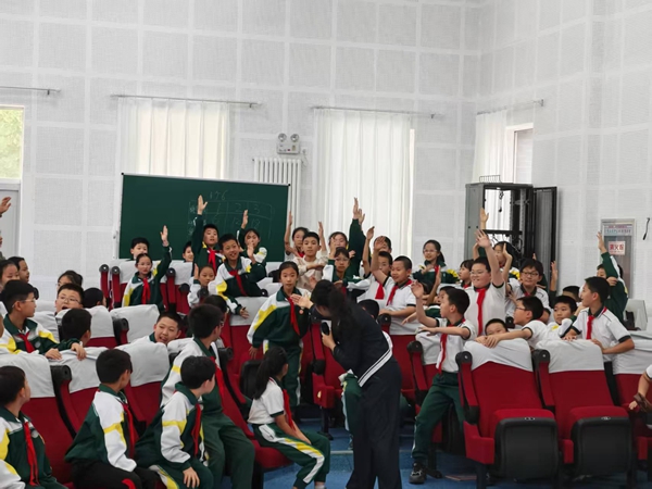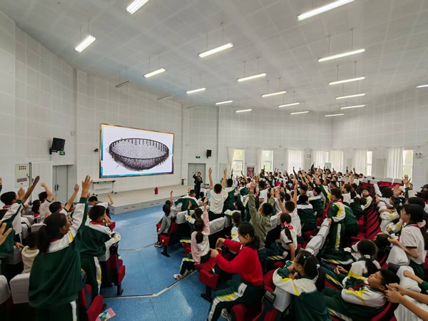 为让抽象的科学家精神变得可感可知,宣讲团队依托绿能数智科普教育基地的互动教学经验,特别设计了贴合小学生认知的互动环节:通过“合作控制水壶高度在1毫米范围内”模拟绿能设备安装的精度要求,“协作立起纸片”还原数智项目研发中的团队协作场景,让同学们亲身体验南仁东团队在建造天眼FAST时,面对毫米级精度要求与复杂工程难题的艰辛,也间接感知绿能数智领域科研工作“精准、协作、坚持”的核心特质。互动现场气氛热烈,同学们踊跃参与,面对老师的提问,纷纷道出真挚心声:“遇到困难我绝不会放弃”“就算国外有更优渥的条件,我也会留在祖国”“哪怕研究目标遥不可及,我依然会坚持”“即便生命终结在完成目标的路上,我也觉得值得”。当老师告知南仁东先生正是将这四点信念融入一生,且这也是绿能数智科普教育基地所有科研与科普工作者的坚守时,同学们由衷发出赞叹,科学家精神的种子在心中悄然扎根。
