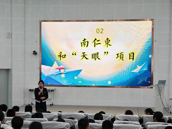 作为聚焦绿色能源与数字智能领域科普传播的专业平台,学校绿能数智科普教育基地在此次宣讲中,始终紧扣“科技为民、创新报国”的核心,将科学家精神与青少年可感知的科研场景深度融合。讲座伊始,张晓鵾老师以“‘星星之乡’宁夏”为情感锚点,巧妙结合语文诗词意境,同时引入基地科普资源中“国之重器与地方发展”的关联内容,将“中国天眼之父”南仁东的传奇一生缓缓铺展。从清华园里仰望星空、为练英文撕词典背诵的“学霸”,到徒步踏遍贵州300余座山头、为“天眼”寻觅最优选址的探索者;从带领团队攻克千余项技术难关、22年坚守铸就国之重器的科研领路人,到生命最后时刻仍牵挂项目进展的奉献者——张晓鵾老师还特别结合基地在绿能数智项目研发中“攻坚克难、精益求精”的实践经历,用一个个鲜活片段串联起科学家的赤诚与坚守,让在场同学不仅读懂南仁东先生“心有大我,至诚报国”的精神内核,更对科研工作者在绿能数智等前沿领域的执着追求有了直观认知。