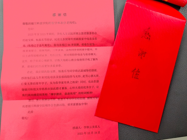 近日,市民李秋云及家人将一面印着“学子志愿暖人心,无私奉献显真情”的锦旗,连同一封情真意切的感谢信,亲手送至人文学院。这份满载谢意的礼物,既是对赵安琪、杨嘉乐两名学子三年如一日默默帮扶的诚挚回馈,更生动彰显了学校的育人实效,尽显当代大学生的责任担当。